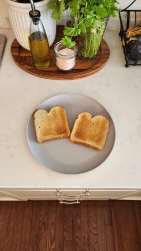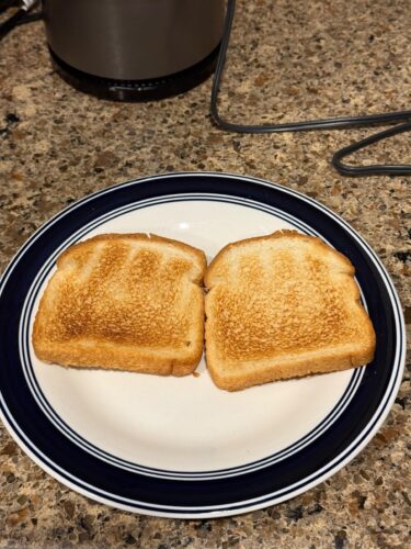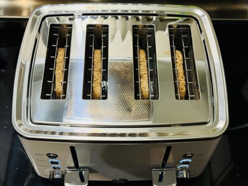 The toaster is very lightweight. I have to hold the back of it when pressing down on the front levers. That’s fine with me as it makes moving it for cleaning easy. The crumb trays pull out and go back in easily. They’re easy to shake or wipe clean. The power cord isn’t super long, which is nice for countertop appliances. I don’t like to look at a bunch of cords wrapping around my countertop.