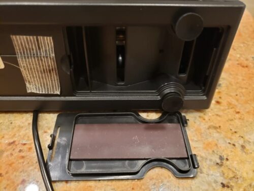 The compartment which collects the sharpening metaldust maybe too shallow, and don't know what's the purpose of a small sponge there.