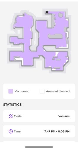 What was really impressive, however, was the vacuuming itself. The next day, we let it go on its first true expedition. Unlike our old one, we still have not seen an error, and it has taken care of itself, even with large tufts of dog fur (we have two double-coated Alaskan Malamutes in full shed). It just didn't care. It took care of everything, emptied itself, and had no clogs! It even had an even better map after working and sent us complete statistics of its work.